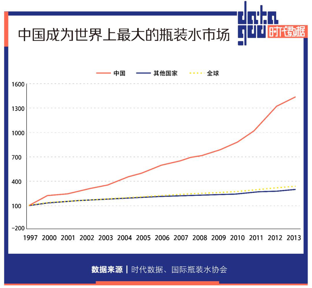 喝更干净,更方便的水,成为了一个巨大的需求。拧开瓶盖就能喝到健康干净的水,瓶装水消费量开始飙升。中国只用了不到20年时间,就成为世界上最大的瓶装水消费国。根据国际瓶装水协会的统计,从1997年的280万吨跃升至2013年的3950万吨;年复合增长率高达18.1%,远高于全球平均水平7.8%。