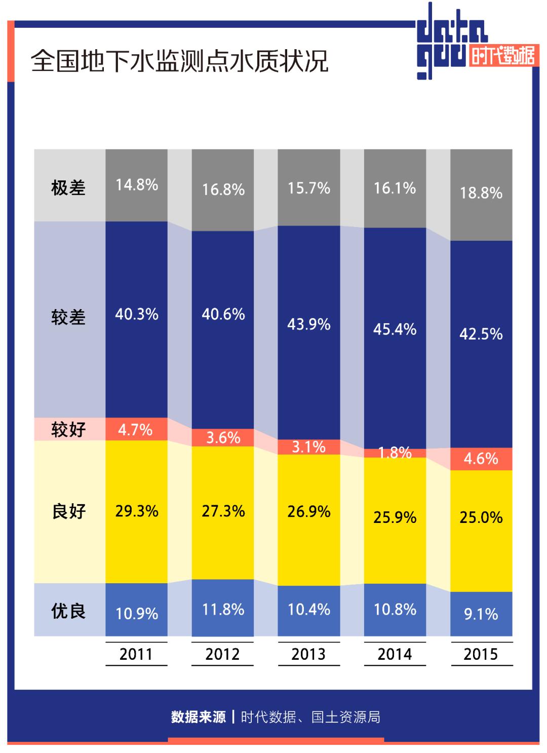 国土资源局发布的最新数据显示,2011-2015年,监测点水质大约六成是差水。