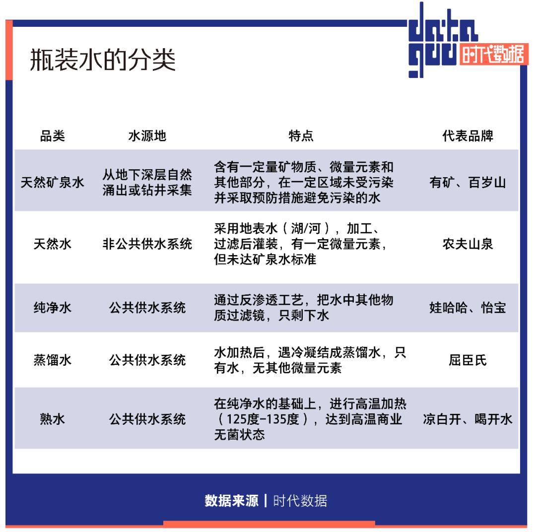 消费者在日常中会习惯将所有瓶装水都称作“矿泉水”,但实际上目前国内大部分品牌均属于包装饮用水,水源来自地表水或公共供水系统。而天然矿泉水除需要是从地下深处自然涌出的或是经人工揭露的、未受污染的地下矿水外,还需要满足国家饮用矿泉水GB8537的国标,是瓶装水市场中相对高端的品类。