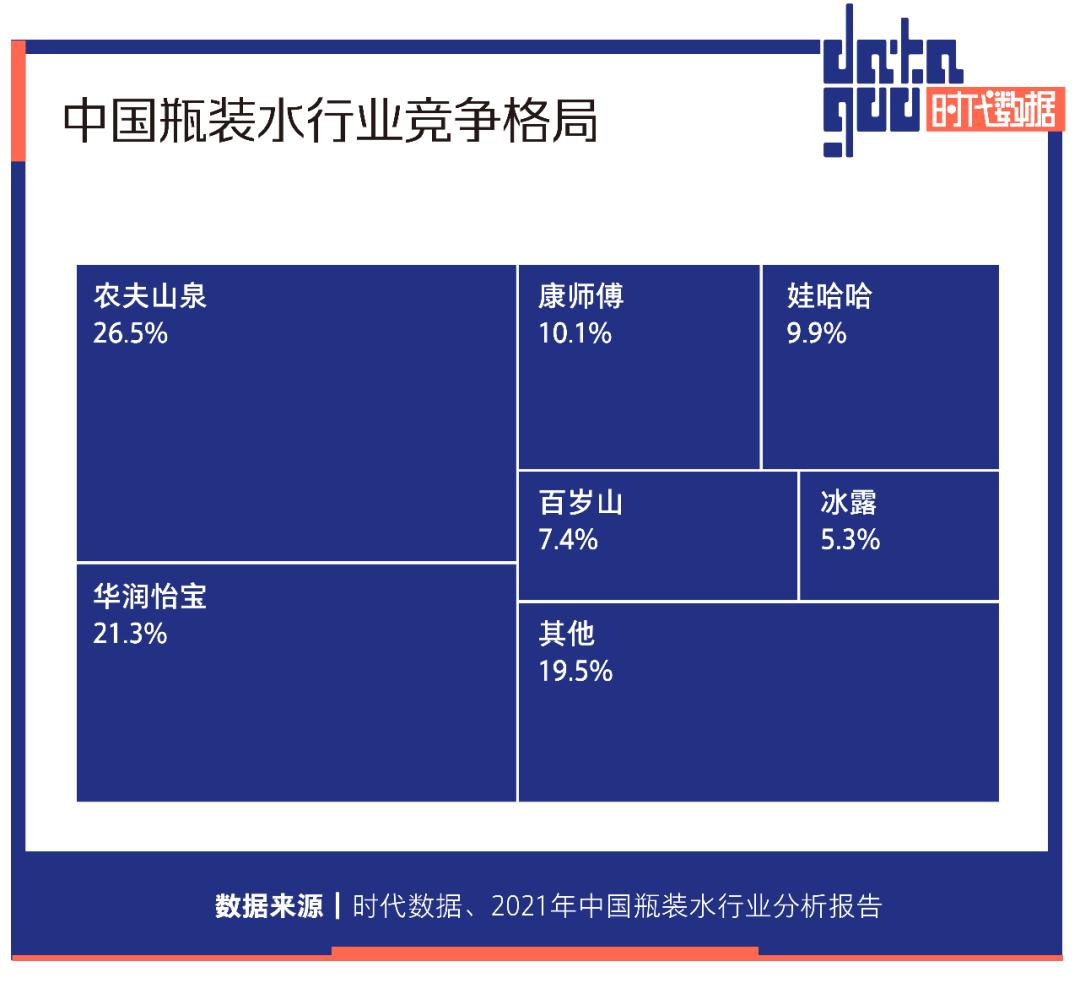 农夫山泉、怡宝以及康师傅三大头部品牌,市场份额分别为26.5%、21.3%、10.1%,占据了瓶装水市场的半壁江山。再加上百岁山、冰露等品牌,八成市场份额基本已被瓜分完毕。