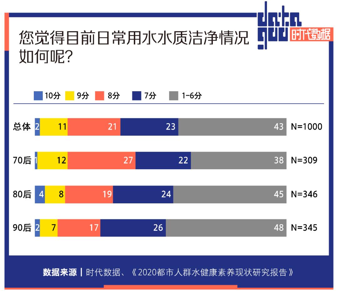 《2020都市人群水健康素养现状研究报告》显示,当代人对目前常用水水质打分,满分10分,选择1-6分的人最多,占比43%。