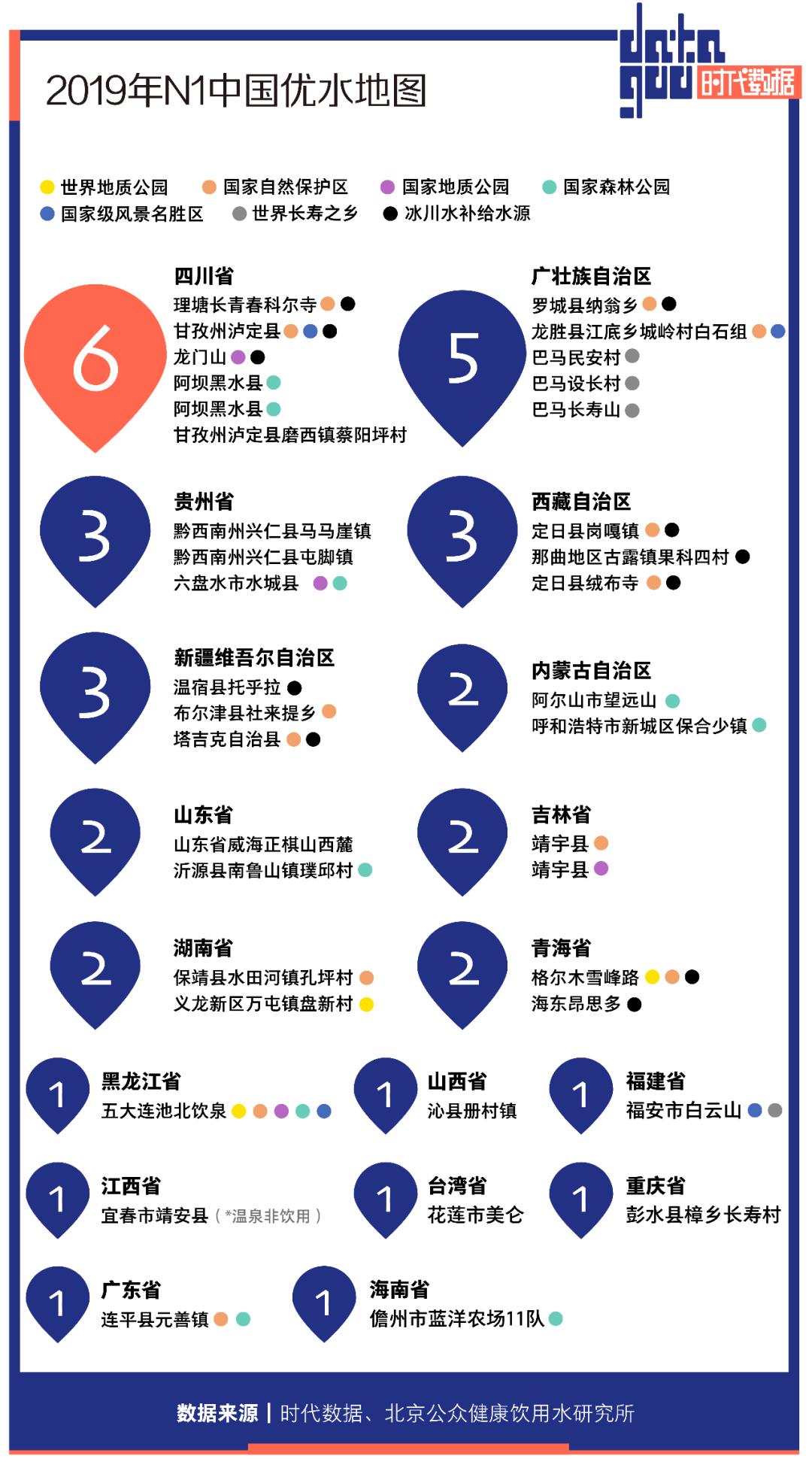 国际健康饮用水产业发展会、中国健康促进基金会等单位根据WHO《饮用水水质准则》及我国《生活饮用水卫生标准》发布的最新版中国优水地图,水源地共38处,大多集中在四川、广西、西藏冰川、新疆产区、长白山及五大连池产区等地。
