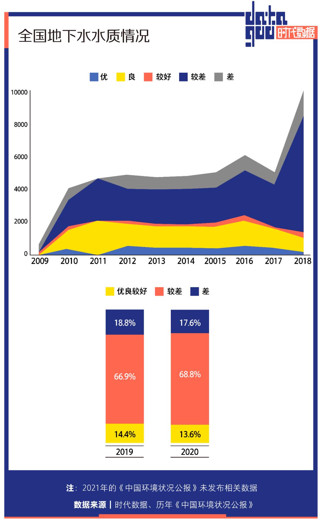 国土资源部的数据更能说明问题。地下水可简单分为浅层地下水(地表下60米左右)和深层地下水(地表下1公里左右),目前地下水饮用水水源主要取自深层地下水。据《南方周末》报道,国土资源部的监测点多为深层地下水。
