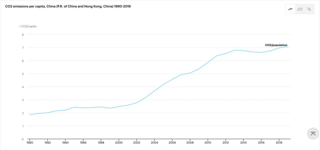 1990~2019年中国人均二氧化碳排放趋势图数据来源:IEA