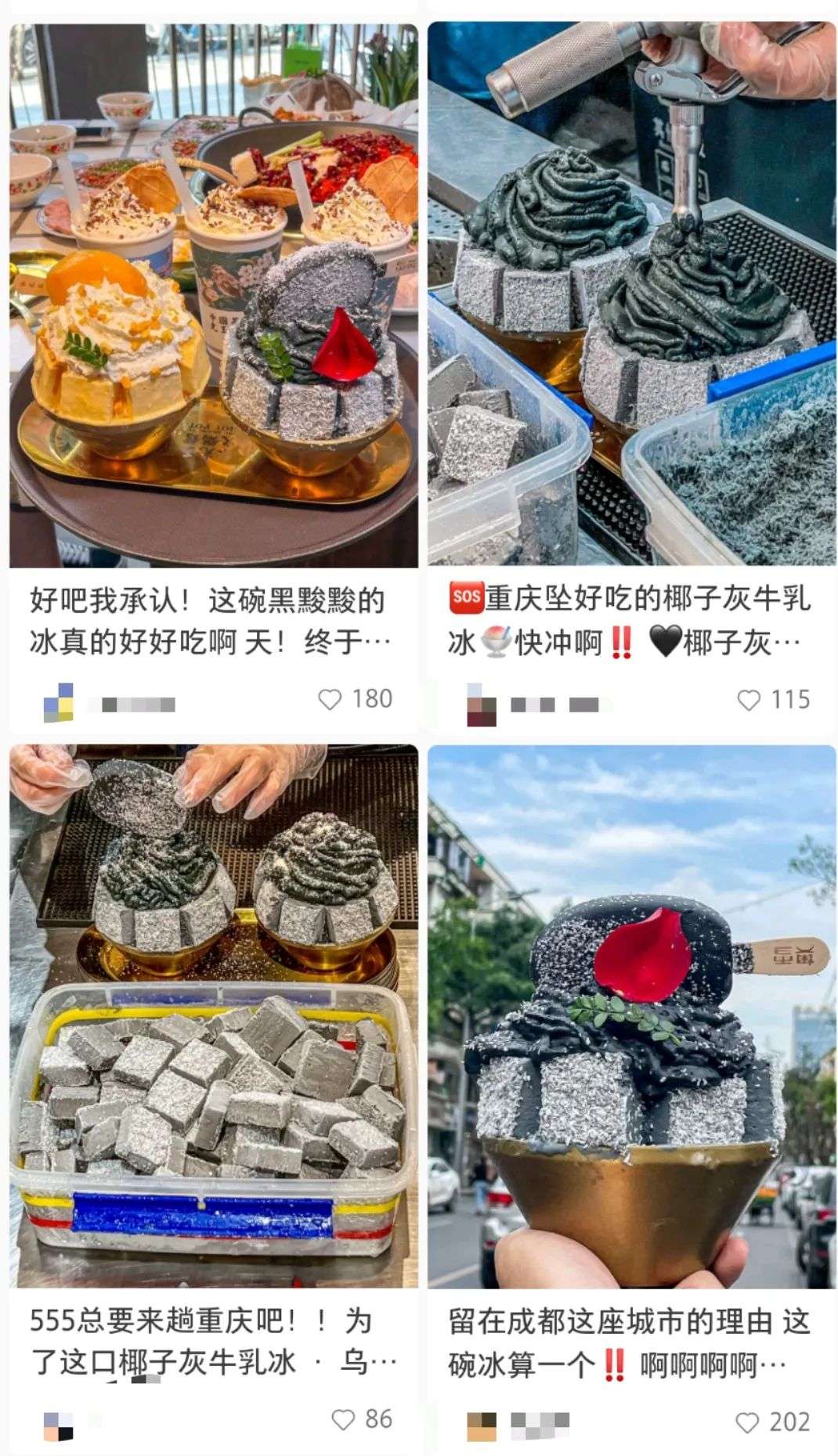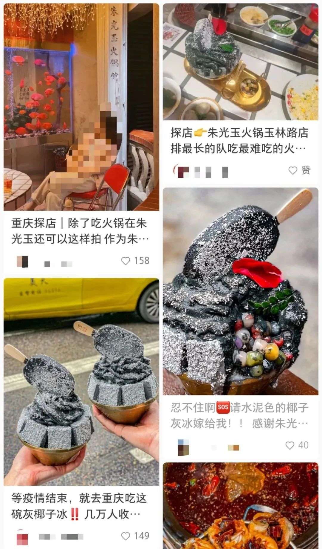 朱光玉火锅馆上新的椰子灰牛乳冰,有一层灰色的厚切酸奶,上面还放着一整支的奥雪,被网友戏称“水泥”甜品;