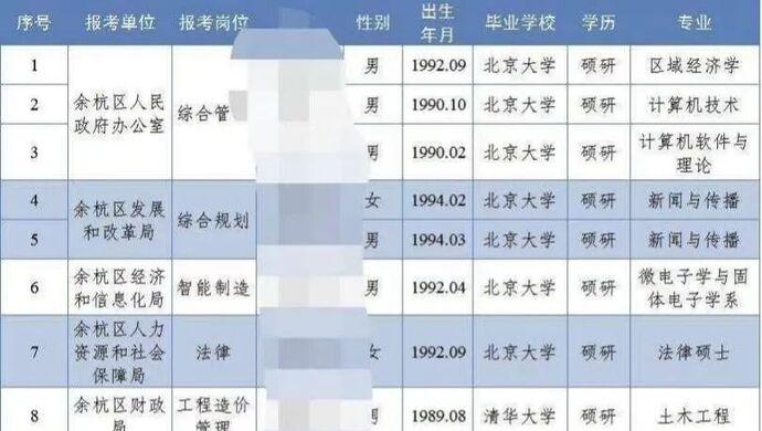 今年4月份,一位毕业于北京大学的女博士,被北京朝阳区酒仙桥街道“城市管理执法岗”拟录用,引起了外界广泛关注。其实早在两年前,杭州市余杭区的一份招聘公示曾因录用者均为清华、北大硕士研究生、博士研究生而引发争议,这份名单中列出的岗位不乏“街道办事处”等基础岗位。据钱江晚报报道,余杭区相关部门称,这份拟录用人员公示名单是2018年初招聘人员的公示名单。
