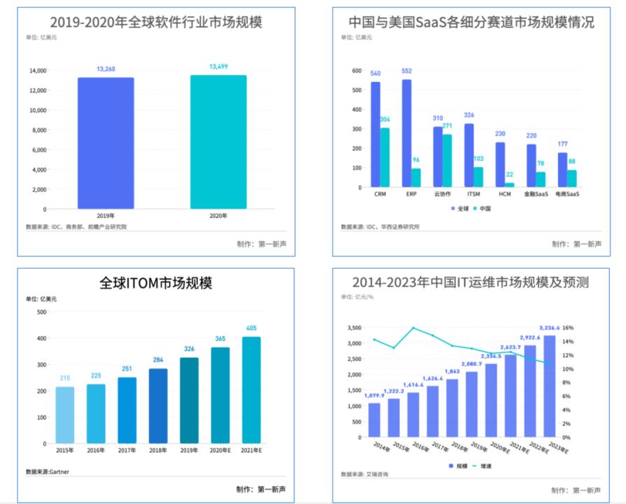 根据Gartner和艾瑞数据显示,2022年全球IT支出预计将达到4.5万亿美元,比2021年增长5.5%, 其中 CRM、ERP、云协作、IT运维等是规模最大的几个赛道。 全球IT运维管理市场规模约为2191.1亿美元。
