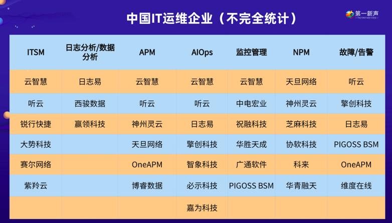 第一新声曾报道过,IT运维领域包括ITOM(IT运营管理) 、ITSM、APM、ITOA、AIOPS等细分赛道,目前国内外头部企业主要包括 ServiceNow、Datadog、Splunk、云智慧、西骏数据、擎创科技、听云、日志易等。 根据第一新声采访调研发现,在各个细分赛道中,以ITOM市场规模最大。