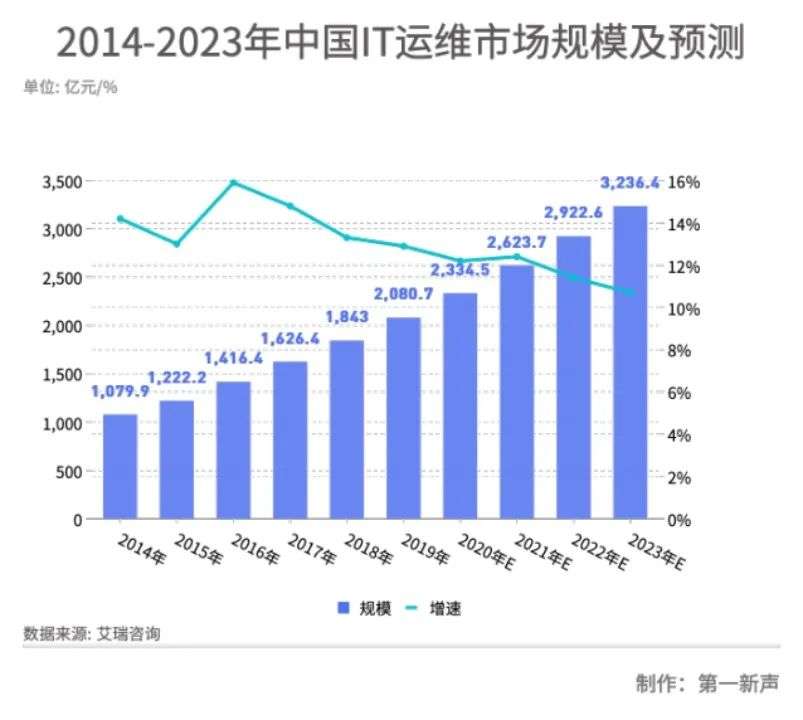 艾瑞咨询数据显示,2021年中国IT服务将突破万亿大关,其中,IT运维市场规模在2021年达到2941.2亿元,预计2023 年达到3236.4 亿元,2020-2023 年的年复合增长率为 11.7%。