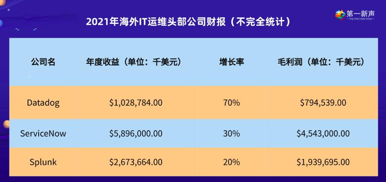ServiceNow、Datadog、Splunk是全球IT运维领域三大龙头企业,根据三家公司财报介绍,2021年ServiceNow营收为58.96亿美元,同比增长30%;SplunK营收约为26.74亿美元,同比增长19.92%;Datadog营收约为10.29亿美元,同比增长70%。