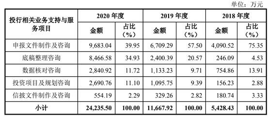 以2020年为例,根据《招股书》数据计算可得,荣大科技为企业提供申报文件制作及咨询业务的共有932家,该部分获得收入为9683万元,平均每家企业的费用为10.38万元;提供底稿整理咨询的共为614家,该部分收入为8466万元,平均每家企业费用为13.78万元;提供数据核对服务的为717家,该部分收入为2840万元,平均每家企业费用为3.96万元。