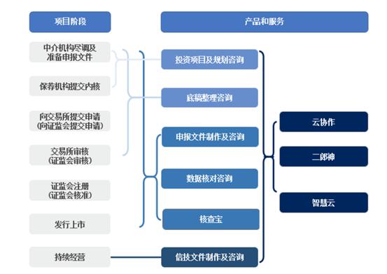 荣大科技的全流程服务按照时间顺序,从注册到发行共包括投资项目及规划咨询、底稿整理咨询、申报文件制作及咨询、数据核对咨询和信披文件制作及咨询。