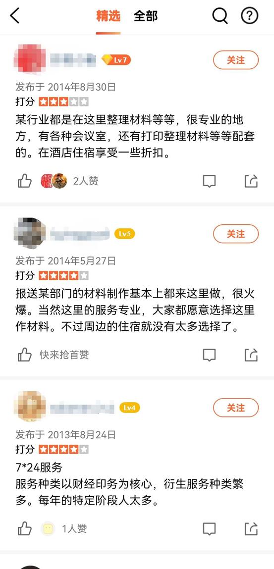 “我们可以看到荣大打印店其实不仅是打印服务,还提供住宿餐饮,洗浴到校对打印,可谓是一条龙服务。这种服务不仅仅是在于打印服务领域,而且它能够真正地实现所谓的包间服务,基本上每个项目都有专门的包间,虽然要花大量的钱用于这个包间,但是由于其特殊的地理位置,就在北京金融街富凯大厦的外面,再加上非常特殊的专业化服务,可以说这家打印店把打印做到了极致。”盘古智库高级研究员江翰表示。