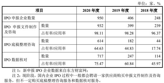 专业化的运作加上地理位置上的优势,荣大科技几乎包揽了A股所有上市公司的相关业务。据《招股书》显示,2018年至2020年,A股市场新增上市公司704家,与荣大科技有合作关系的有692家,比例为98.3%。