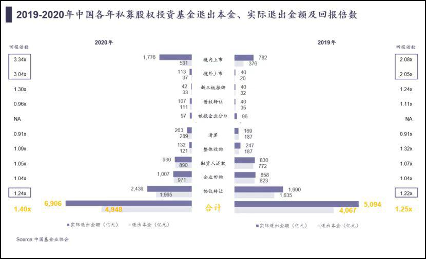 中国基金业协会数据显示,2020年人民币PE/VC总体退出回报倍数为1.4倍,其中境内上市退出回报倍数为3.34倍,境外上市为3.04倍,而其余退出方式的回报倍数不足1.3倍。