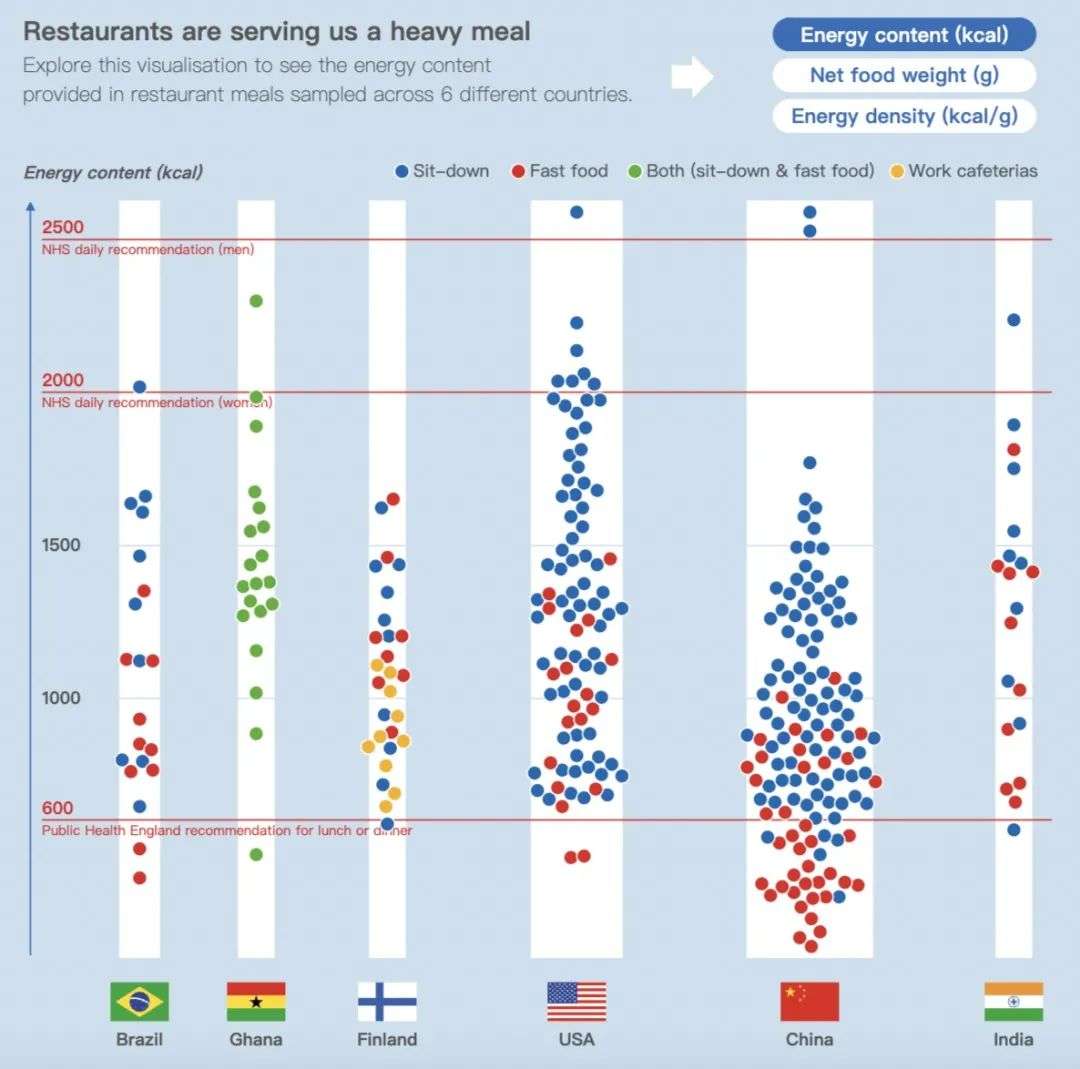 2018年,《英国医学杂志》的一项研究对比了巴西、加纳、芬兰、美国、中国、印度(下图从左到右)六个国家的 223 种本地快餐和饭店菜,都是饺子和拉面这个档次的。