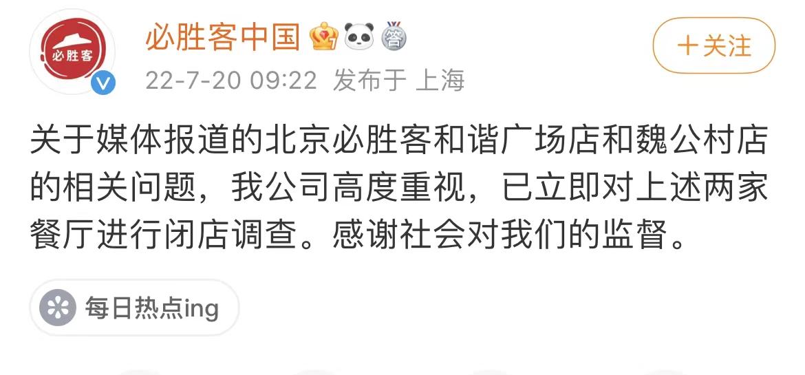7月20日,针对门店食品安全问题,必胜客通过官方微博发布声明进行回应。必胜客称,“关于媒体报道的北京必胜客和谐广场店和魏公村店的相关问题,我公司高度重视,已立即对上述两家餐厅进行闭店调查。”
