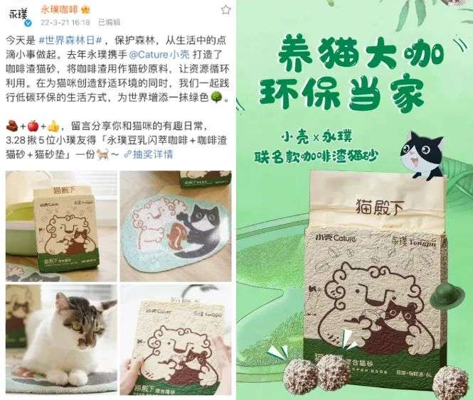 永璞也在21年和小壳一起打造了联名款“咖啡渣猫砂”,希望在为猫咪创造舒适环境的同时,推动低碳环保的生活方式。