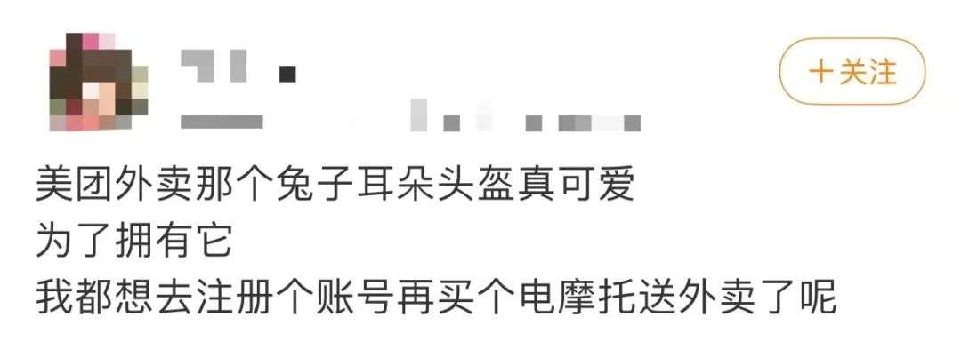 在网上,美团骑手的兔子耳朵头盔常被年轻人羡慕。有网友称,为了拥有兔子耳朵头盔,都想注册个账号再买个电摩托送外卖了。