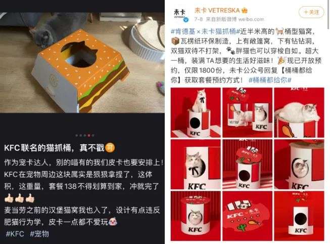 今年7月初,肯德基和未卡联名发售“猫抓桶”,上海地区限量1800份被瞬间抢空。年轻人纷纷表示“全网小猫咪都在找”、“喵圈好卷”、“别的小猫咪有,我们也不能输”。