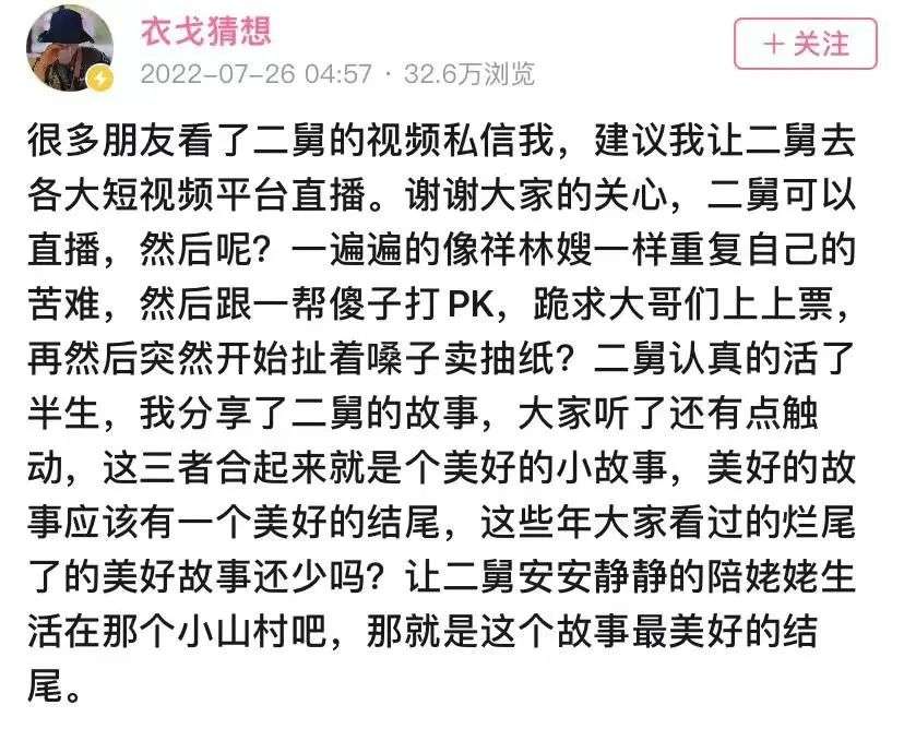 二舅火了,然后呢?有人开始琢磨二舅做直播的可能性。对此,衣戈猜想的回应是否定的,他甚至表示,希望热度快点下去,让二舅安安静静地生活。二舅不会直播的同时,也希望不要有博主来到二舅家门前直播打扰他的生活。