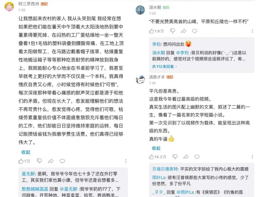 短视频编导罗布言总结了自己的观后感:“顶级文案+朴实画面,没有技巧,全是感情。”