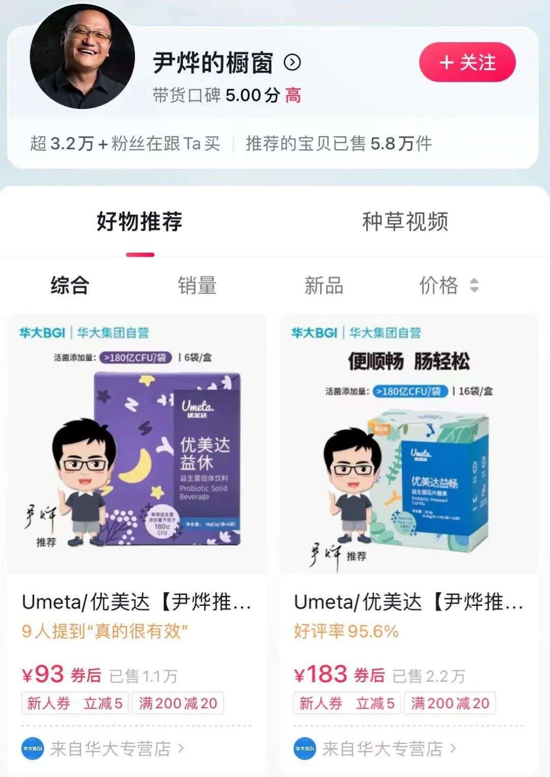 据悉,尹烨的抖音橱窗内,除了包括一些有关科学、科技、历史等书籍外,剩下的有华大基因旗下的一些护肤品和饮品。其中销量最高的两款商品,分别是2.2万销量售价183元/64片的益生菌糖片,和1.1万销量售价93元/6袋的益生菌固体饮料。