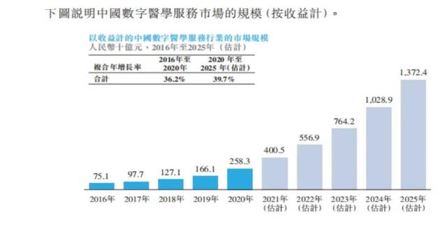 根据弗若斯特沙利文报告,在这种趋势的推动下,按收益计,2020年中国数字医学服务市场规模达2,583亿元,且预计将以39.7%的复合年增长率进一步增长,到2025年达13,724亿元。