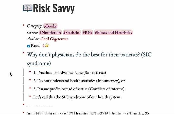 (本例使用的标签,比如#Risk、#Statistics等,适用的是书籍本身,但对书籍的内容并不适用。如果我希望这些标签广泛应用的话,我会在元数据块下方缩进注释。)