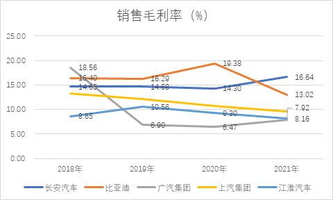 笔者翻阅了国内外多家车企的财报发现,无论在毛利率还是在净利率上,国外的车企均要略高于国内车企,但整体的盈利水平都不算高。以广汽集团为例,近三年的毛利率仅有7%左右,可以说是行业最低了,而同时期长安汽车毛利率在15%左右,比亚迪是国内毛利率水平最高的车企。