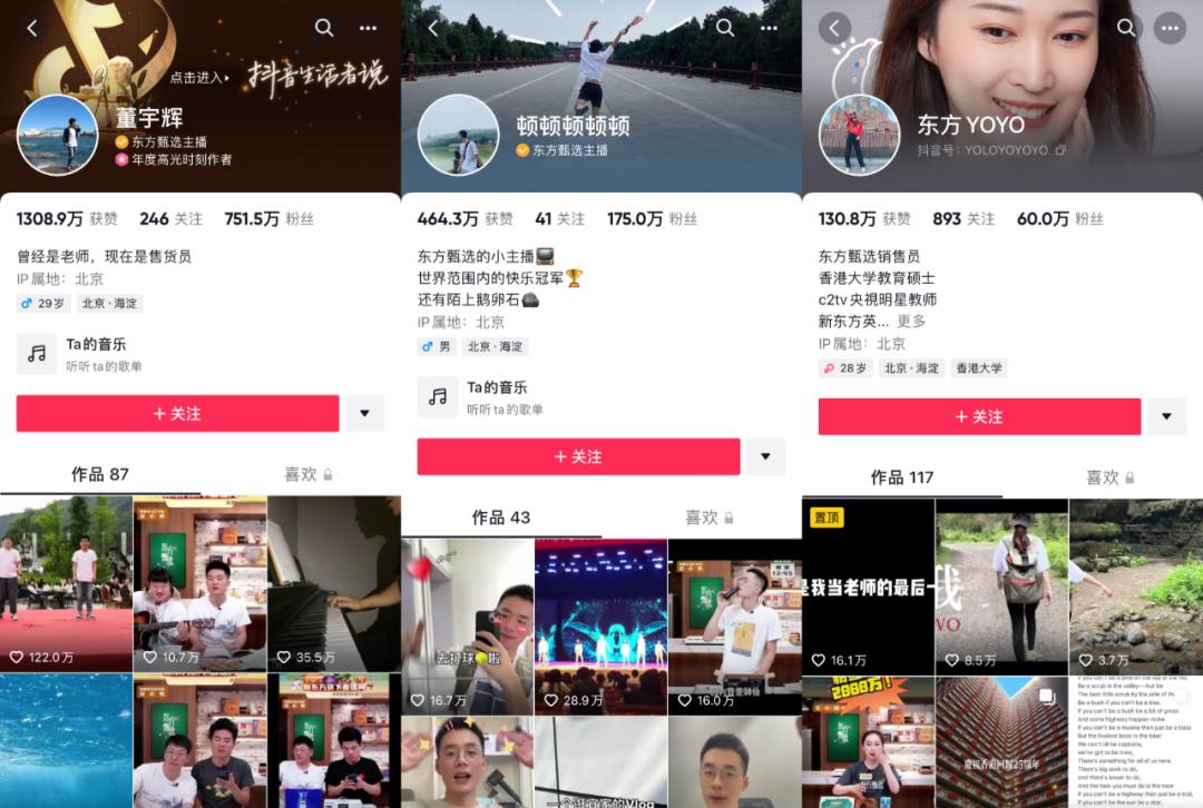虽然董宇辉用心良苦,但其他主播如何承接住他的流量,并不能仅靠“迟到”几分钟来曲线救国。以抖音粉丝量为参考,董宇辉个人账号已有751.5万粉丝,而其他经常出镜的主播如顿顿的粉丝量为175.0万,YOYO的粉丝量为60.0万,几位主播之间的关注度存在明显差距。