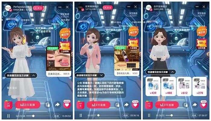 除了常见的人海战术,也有品牌直播间选择启用虚拟主播,以保持24小时连轴转的直播频率。