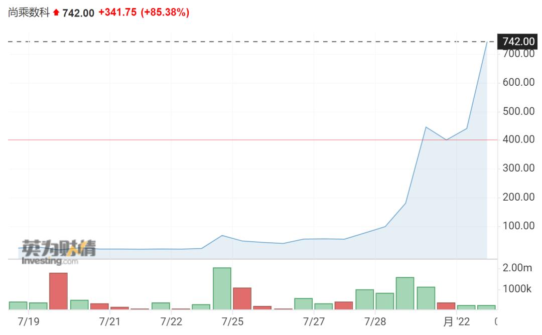 截至8月1日收盘,尚乘数科股价已飙升至742美元。这意味着,自上市以来的短短12个交易日内,该公司股价已经上涨近100倍,市盈率超6000倍,市值达1373亿美元,直追中概股中市值最高的台积电与阿里巴巴。