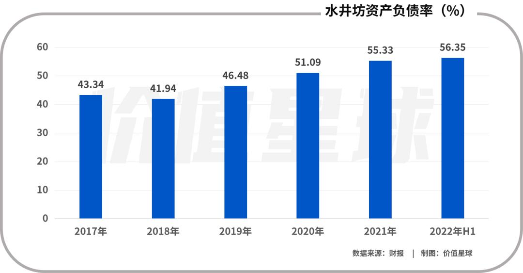 2021年年报时,价值星球(ID:ValuePlanet)就发现水井坊的资产负债率在走高,从2017年的43.34%增加到2021年底的55.33%。到了今年6月份,水井坊资产负债率进一步攀升至56.35%。
