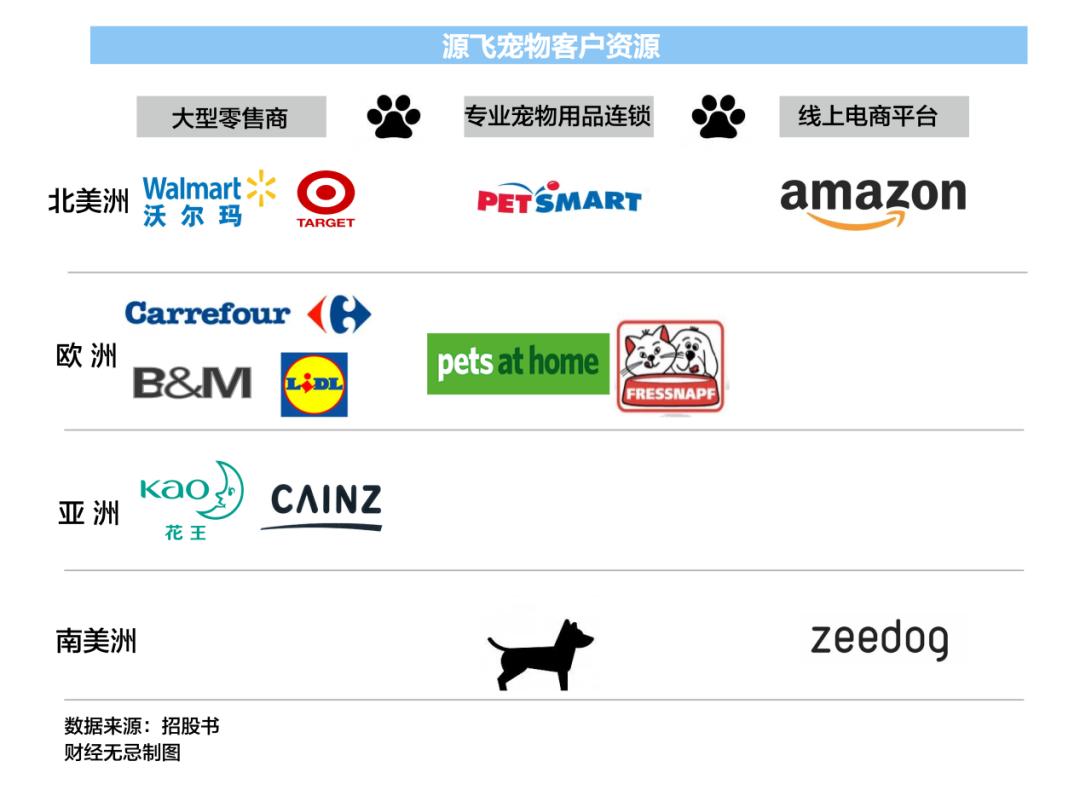梳理源飞宠物的渠道资源,除了线上电商平台亚马逊外,既包含了如沃尔玛、Target、花王、CAINZ、家乐福等大型零售商,同样也涵盖了专业宠物用品连锁商如PetSmart和Pets at home。