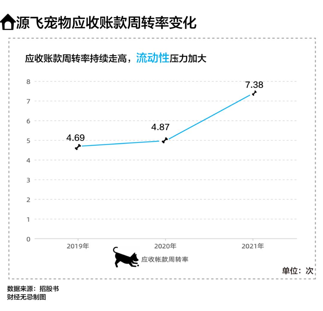 其中,源飞宠物应收账款周转率在2021年达到了7.38次,可比公司如依依股份则为5.4次,佩蒂股份为6次。
