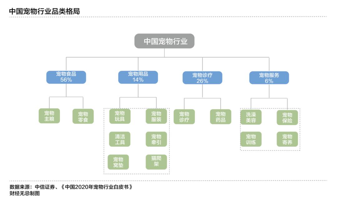 根据Pethadoop发布的《中国2020年宠物行业白皮书》数据,在中国宠物行业的千亿市场规模里,宠物食品占比接近六成,宠物诊疗与宠物服务占比超三成,而宠物用品占比在仅10%上下。