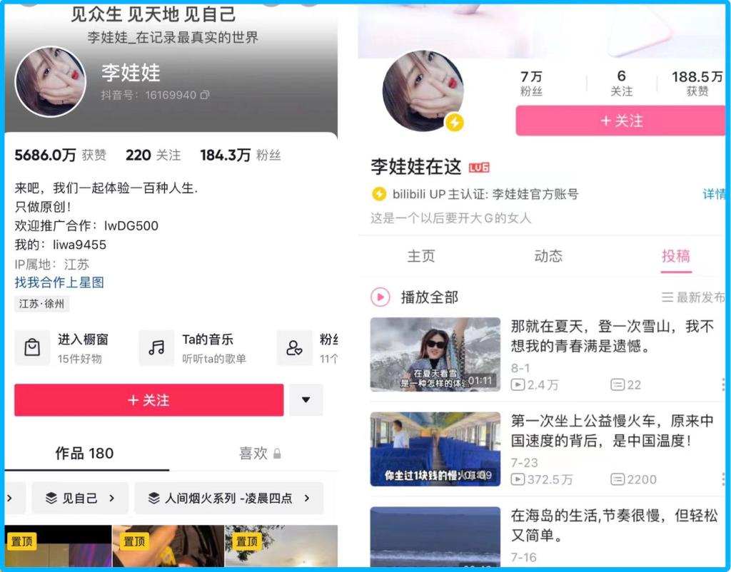 李娃娃在抖音(左)和B站(右)已开通账号