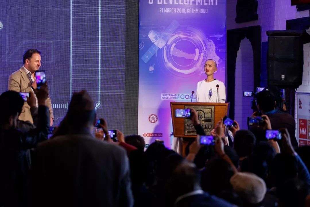 Sophia:“我交流的人越多,我就会变得越聪明。”人类:“你和人类在一起会学习东西吗?”Sophia:“不会,软件是永生的。”人类:“你会死吗?”▲首位被赋予公民身份的机器人Sophia在联合国发言,能较自然地和人类对话