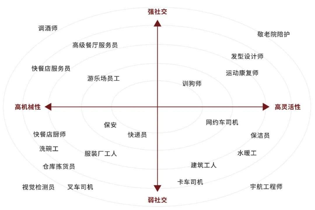 ▲劳力型工作被AI接管的二维图,强社交、高灵活性的工作不容易被AI取代
