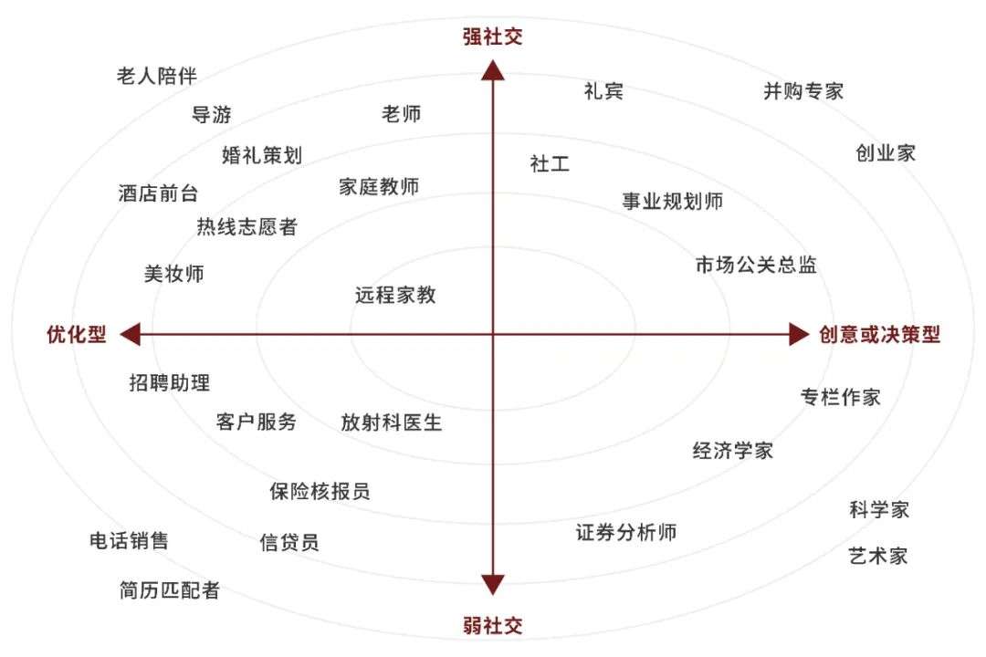 ▲智力型工作被AI接管的二维图,创意或决策型、强社交的工作不容易取代