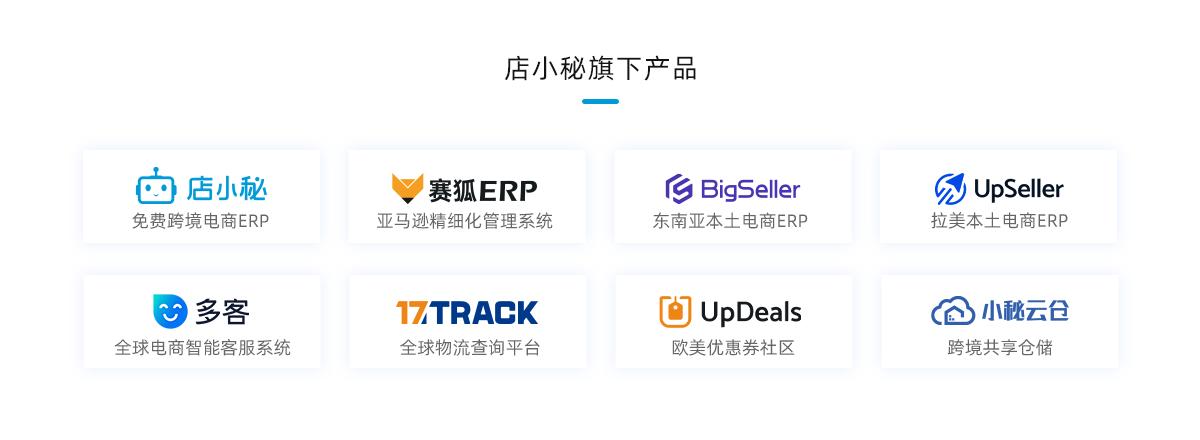 店小秘目前已构建了以ERP为核心的多元化产品矩阵,打造了免费跨境电商ERP“店小秘”、亚马逊精细化管理系统“赛狐ERP”、东南亚本土电商ERP“BigSeller”、拉美本土电商ERP“UpSeller”、全球电商智能客服系统“多客”、全球物流查询平台“17TRACK”、跨境共享仓储“小秘云仓”等多款产品,构建了电商ERP、客服系统、物流查询、云仓服务四位一体的产品生态体系,覆盖了东南亚、拉美、欧美等国家和地区。