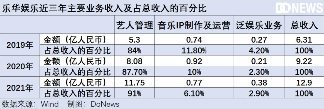 2019年-2021年三年时间,乐华娱乐总收入28个亿,而三项主营业务中,最主要的明显是艺人管理业务。根据弗若斯特沙利文(乐华娱乐委托的独立行业顾问),在中国高度分散的艺人管理市场中,就2021年艺人管理收入而言,乐华娱乐拥有最大的市场份额,为1.9%。