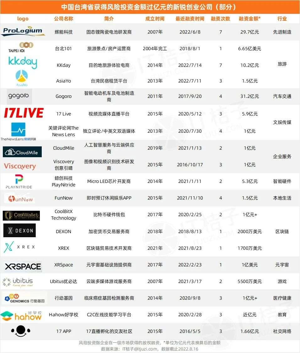 更多获得了超亿元融资的台湾新锐创业企业,可详见下表。