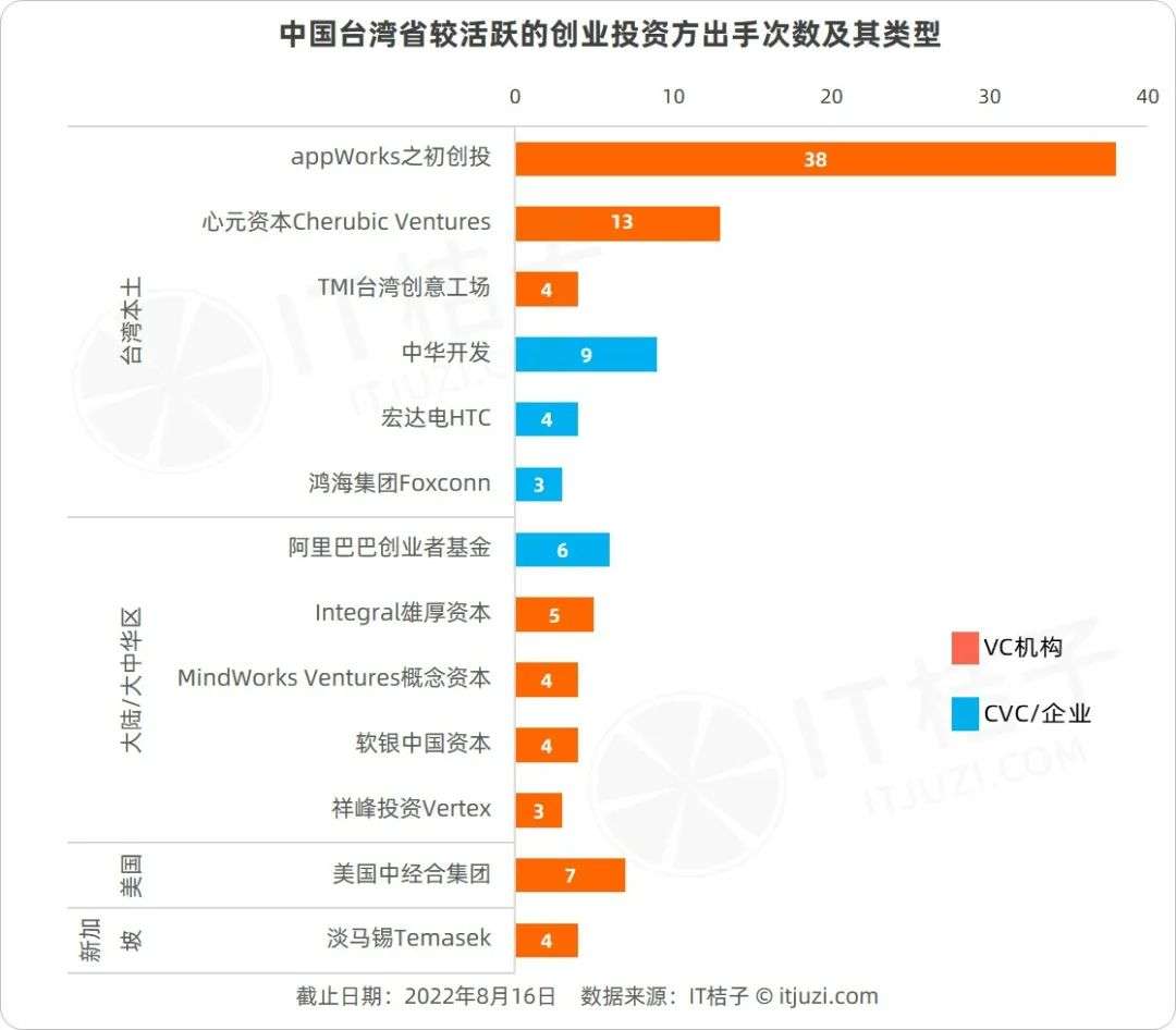 从投资方类型来划分,台湾活跃投资方以VC机构为主,仅有少数CVC活跃着,比如台湾中华开发金融公司,半导体产业公司HTC宏达电和鸿海集团。