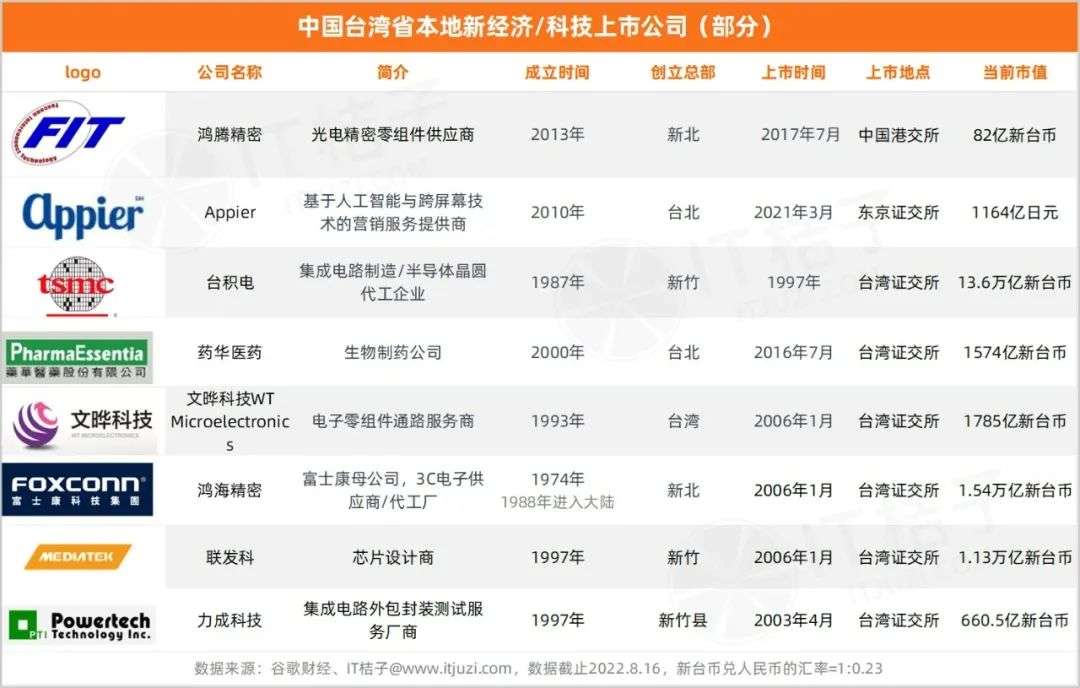 虽然台湾的创业企业相比大陆的体量不是一个级别,但台湾在新经济领域诞生了一些市值达到万亿新台币的上市公司,主要集中在半导体、集成电路产业。