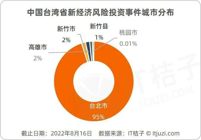 从城市分布来看,IT桔子数据显示,台湾的新经济风险投资事件有95%集中在台北市,仅有少量的事件发生在高雄市、新竹市等。