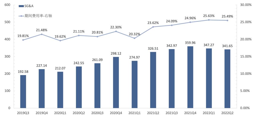 期间费用率总体保持稳定的同时,结构上的此消彼长值得关注。其中,销售及市场推广开支在2022Q2同比下降21%至79亿元,降本增效成果显著;然而,由于研发、雇员成本、办公成本等开支增加,导致一般及行政开支却同比增长16%至262亿元。