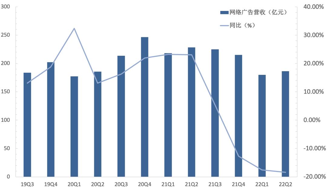 在2022Q2,网络广告业务实现营业收入186.38亿元,同比下滑18.37%。收入增速之所以出现明显下滑,主要由于4、5月间一线城市受疫情影响,互联网服务、教育、金融等传统强广告需求领域却需求疲软,导致腾讯广告业务受到较大冲击。