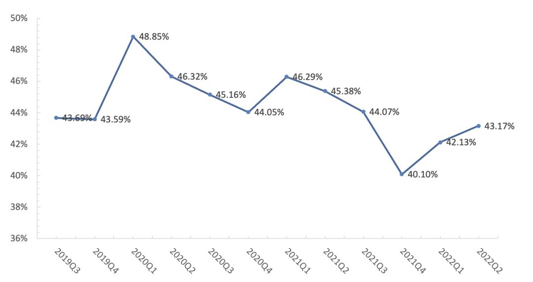 主营业务盈利能力方面,腾讯近年来的毛利率水平一直保持在40%以上,2019Q3~2022Q2间的単季毛利率中位数在44%。虽然今年以来腾讯收入增长承压,但通过一定的降本增效措施,比如对广告业务的内容成本优化、主动缩减亏损的金融与企服项目等,营业成本环比下降,毛利率则环比上升了1pct。